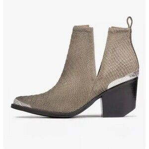 Suede, pointed-toe Jeffrey Campbell booties styled with a split shaft and metallic accents.