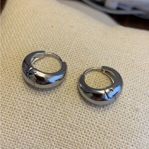 New 3/8” huggie hoop earrings. Silver tone jewelry. Easy to clasp. High quality stainless steel jewelry does not turn or tarnish. Can wear anywhere. Even in water. Lightweight and comfortable.