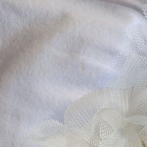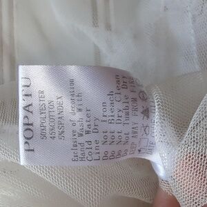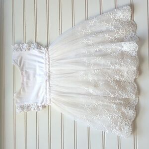 Charming white dress with lace overlay. Features floral accent and ruffled sleeves. Ideal for formal occasions.
