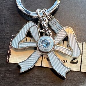 Coach NWOT keychain with a silver tone metal and blue bow. Stylish addition to your keys. Ships in a jewelry gift box.
