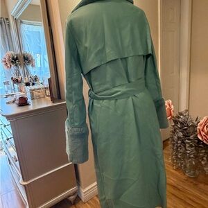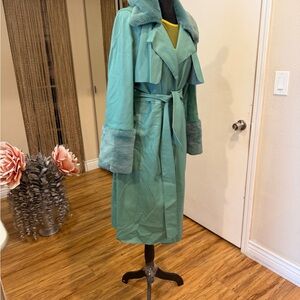 Elegant aqua trench coat with faux fur collar and cuffs. Features a belted waist for a tailored fit.