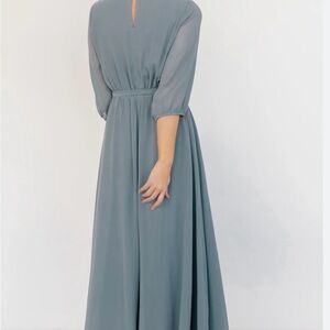 Chic dusty blue maxi dress with a flowing silhouette. Features a waist tie and three-quarter sleeves. Perfect for elegant occasions.