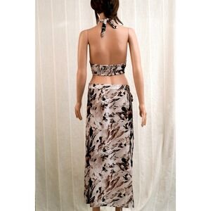 Ziba Atelier Tulum two-piece set offers a sophisticated take on resort wear with its abstract brushstroke print in earthy brown and cream tones. The halter crop top features a plunging neckline with a front tie detail and a smocked back for a flexible fit. Paired with a matching maxi-length wrap skirt, the ensemble creates a cohesive and breezy look perfect for vacation or summer events. The skirt is designed with a side tie closure that creates a natural high-slit effect, crafted from a lightweight fabric that ensures movement and comfort.
