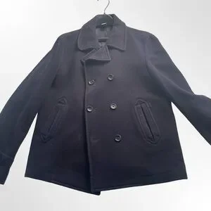 Stylish dark blue peacoat with classic double-breasted design. Ideal for versatile wear.