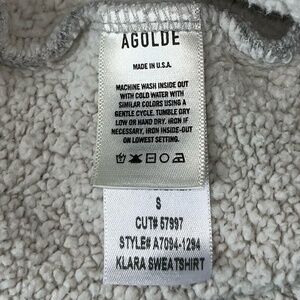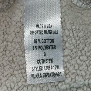 97% cotton, 3% poly. Made in USA. Machine wash. Ribbed neckline, cuffs and hem. Heavyweight brushed fleece fabric. Revolve Style No. AGOL-WK40. Manufacturer Style No. A7094-1294.
