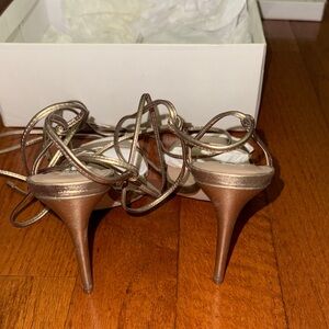 Stylish metallic heels with intricate straps. Perfect for evening wear.