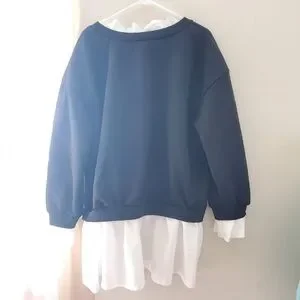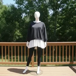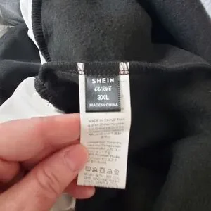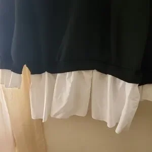 SHEIN mock-layer black sweatshirt with white ruffles. Literally a heavy sweatshirt with white polyester material sewn into the neckline, arm cuffs and bottom hem. Purchased 3X because I wanted an oversized look. Shirt is too boxy and does not suit me, so my loss is your gain!