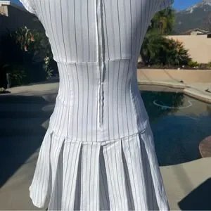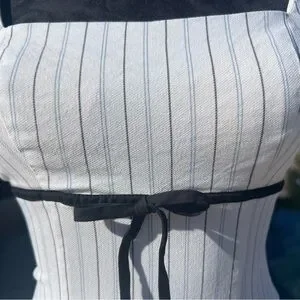 Pinstripe mini dress featuring a square neckline, cap sleeves, and an adjustable tie-back empire waist. Soft stretch fabric hugs the bodice while the pleated skirt gives a playful, flirty silhouette. Fully lined and comfortable with a structured yet flexible fit. Perfect for summer brunch, date nights, graduation, or a coquette/Y2K inspired