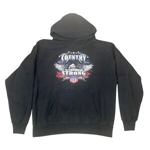 Windjammer hooded sweatshirt in black features a bold "Country Strong" graphic on the front with a bald eagle and American flag shield motif. This heavy-duty pullover includes a front kangaroo pocket and ribbed cuffs and hem for a classic fit. Made in the USA, the garment is constructed from a durable cotton blend fabric that offers both warmth and comfort.