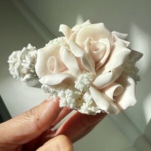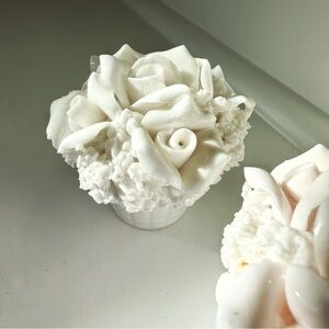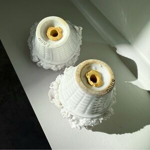 Vintage porcelain salt and pepper set in white and pale pink flower baskets.