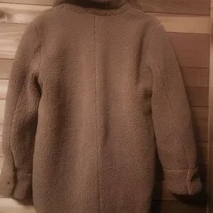 Chic utility jacket with faux fur hood. Ideal for cold weather. Features drawstring waist and front pockets.