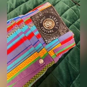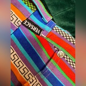 Rare 90s statement denim featuring bold multicolor vertical stripes and signature Greek key detailing throughout. Authentic Medusa hardware and original leather back patch.