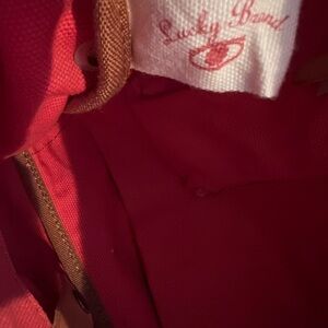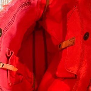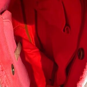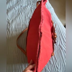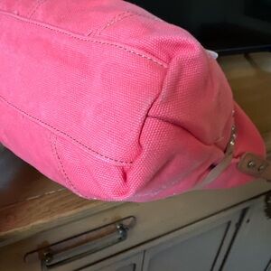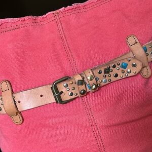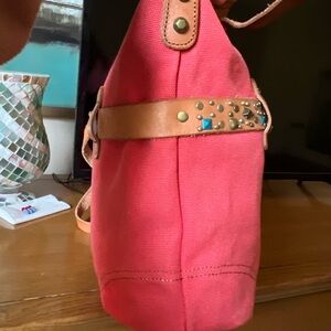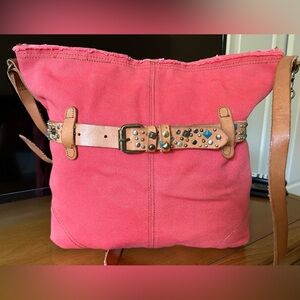 Beautiful Lucky Brand canvas crossbody / shoulder bag featuring a bold coral pink body and signature boho western styling. This eye-catching piece is accented with a genuine leather belt strap across the front, detailed with mixed metal studs and turquoise-tone embellishments for that iconic Lucky Brand vibe.