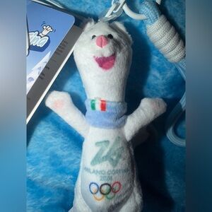 The item is a plush keychain of Tina, the official mascot of the Milano Cortina 2026 Olympic Winter Games.