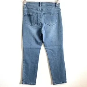 Excellent used condition. Waist flatlay 16”, Inseam 27”, Rise 10 1/2”. Features a high-rise, slim ankle, five pocket design and a light wash denim. Color is light blue.