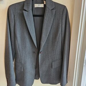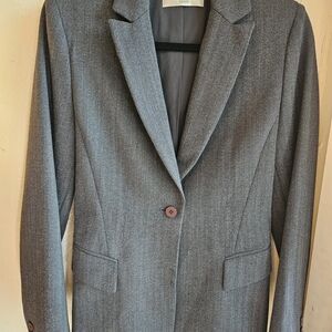Sophisticated DKNY blazer in charcoal gray wool blend. classic 90s blazer silhouette. lining is polyester, includes extra buttons. worn but kept in great condition.