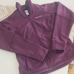 Columbia softshell jacket in a deep plum shade. Features full-zip design. Ideal for outdoor wear.