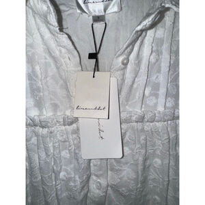 This is a new Line & Dot white tunic top, size S, with tags attached. It features a collared, button-front design with a textured, embroidered floral and dot pattern throughout. The top has a relaxed fit, 3/4 length sleeves with elasticated cuffs, and a ruffled hem. There are pintuck details on the front bodice. A visible makeup stain is present on the upper back/shoulder area. Approximate measurements are DTP 21 and length 32.