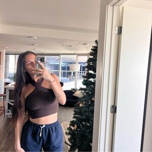 Aritzia Babaton Sculpt Knit Criss Cross Tank size XS. In the color coffee bean (chocolate brown). This is a fully fashioned halter top with a cross-front neckline and body-hugging fit. It’s made with Sculpt Knit — Babaton’s signature figure-smoothing yarn. The perfect amount of stretch hugs in the right places to shape and sculpt your form. This version is constructed with a Jersey stitch for a soft drape and a smooth, flat feel.