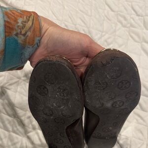 Chic dark brown flats with signature gold emblem. Ideal for everyday elegance. These have been worn, but still tons of life left in them. The sole at the toe area has peeled a little, but glued down great and you can’t see it when wearing them