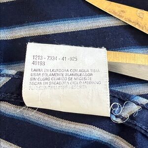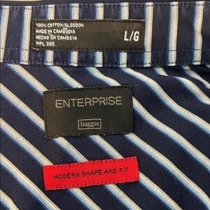 Modern shape and fit navy dress shirt with white stripes by Haggar. Extra buttons attached. Machine washable