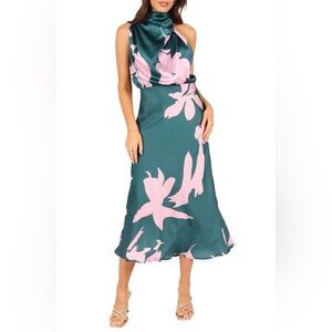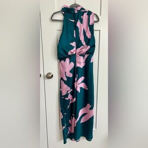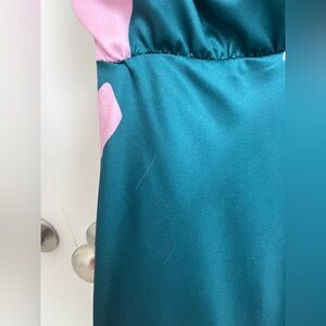 Anabelle Mock Neck Satin Midi Dress US M Teal Pink Mock Neck Cocktail Wedding