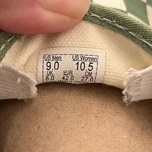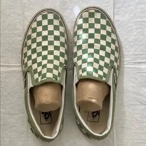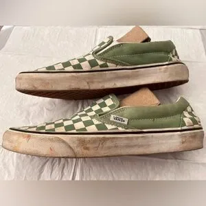 Classic Vans slip ons in sage green and white checkered pattern. 9 men, 10.5 women. Original owner, clean inside, good out soles, visible wear and stains on midsoles, vamp of right shoe, and heel of left shoe. Perhaps a good wash would take care of it.
