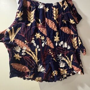 Navy skirt with vibrant floral design. Features pink, cream, and brown accents.
