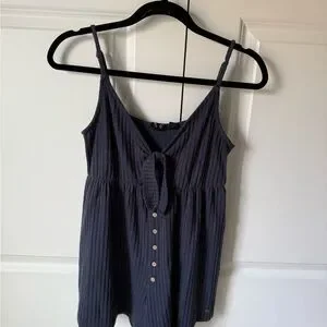 Chic dark blue jumpsuit with button-front detail. Features a tie at the bust and adjustable straps. Perfect for casual outings.