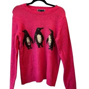 Keywords: pink penguin sweater, sequin penguin sweater, novelty holiday sweater, cute winter knit, festive Christmas sweater, whimsical animal sweater, cozy chic pullover, statement knit, speckled sweater, winter party outfit, unique.