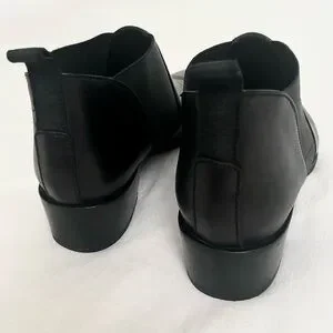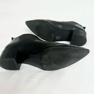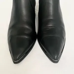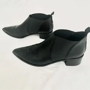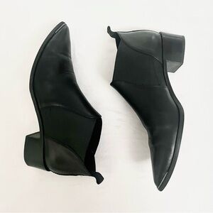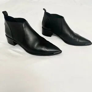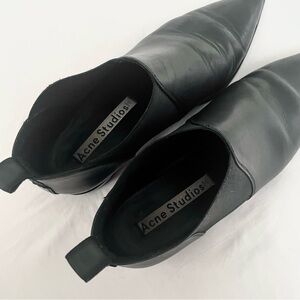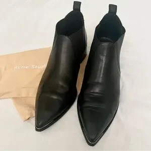 Acne Studios Jenny Pointed Toe Low Ankle Chelsea Bootie/Boots in Smooth Black Leather, size 40 (US size 9.5, size down if between sizes in lieu of the pointed toe style), like new condition, some creasing across the toe box, small scuff on one of the toes (see close-up in image 4), soles are still in excellent condition (not sure these even made it outside), dust bag included but no box.