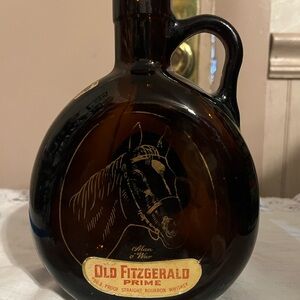 Vintage Old Fitzgerald Prime bourbon bottle with horse design. Rich brown color.