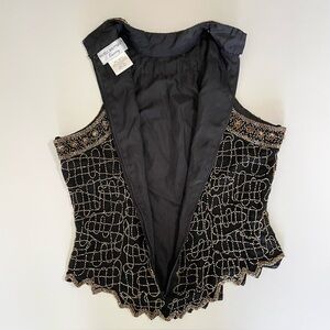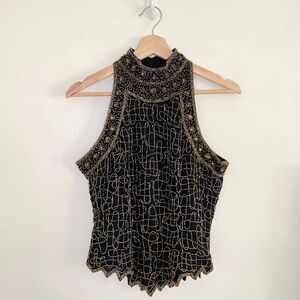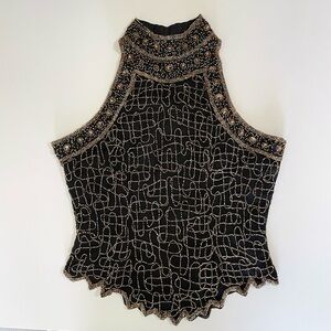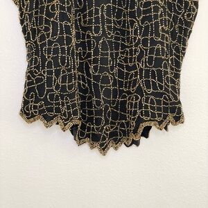 Vintage Papell Boutique Evening Beaded Silk Art Deco High Neck Top in Black / Gold, Women’s Size Medium Petite.