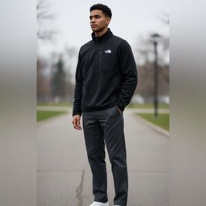 The North Face Men's Skyline 1/2-Zip Fleece (TNF Black) is a versatile, stretchy, and breathable mid-layer made from \(225\text{\ g/m}^{2}\) \(96\%\) recycled polyester/\(4\%\) elastane. It features a smooth-faced, brushed-back design for comfort, with reverse-coil zippers on the chest and hand pockets. Ideal for active wear, it includes a Vislon® center zipper and micro-elastic binding at the hem. Key Features & Details Material: \(225\text{\ g/m}^{2}\) \(96/4\) recycled polyester/elastane with peached, brushed back.Design: Smooth-face fleece with a brushed interior for warmth and comfort.Closure: Vislon® center zipper.Storage: Reverse-coil zippered chest pocket and zippered hand pockets.Fit: Micro-elastic binding at the hem for a secure fit.Branding: High-density The North Face logo heat transfer on the left chest.Style: Specifically comes in solid Black.Performance: Offers stretch for increased mobility and is breathable. This garment is often used as a base layer or light jacket, suitable for active pursuits.