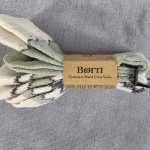 The NWT Born Crew Socks are a luxurious 2-pack featuring a green and gray color scheme with a geometric pattern. Made from a blend of cashmere, wool, polyester, and more, these crew socks are both lightweight and breathable, making them perfect for any season. With a crew length and full toe style, these socks are suitable for casual, formal, workwear, and business occasions. The Born brand ensures quality and comfort for women in shoe sizes 4-10. Machine washable and featuring an opaque design, these colorful socks are a stylish and versatile addition to any wardrobe.