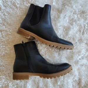 These black ankle boots feature a sleek leather design with elastic side panels for easy slip-on wear. The boots have a rounded toe and a slightly textured sole for added traction. Perfect for any occasion, they offer both style and comfort.