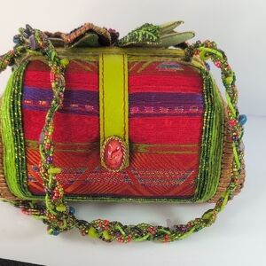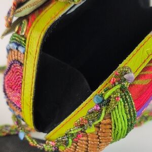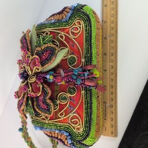 Exquisite Mary Frances shoulder bag or crossbody with intricate floral beadwork. Features vibrant multicolor patterns. Ideal for a bold fashion statement.