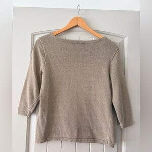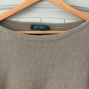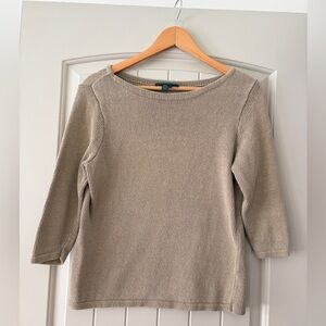 Lauren Ralph Lauren light olive/khaki-tan knit sweater/top. This is a beautiful, heavy-weight 100% cotton piece in a versatile "muted sage" or "dark sand" shade that pulls subtle green undertones. It features a flattering boatneck and 3/4 length sleeves.