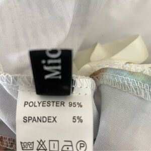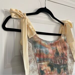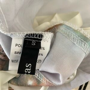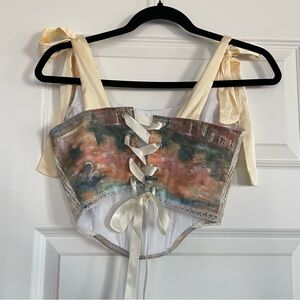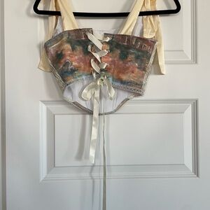This stylish crop top features a vibrant multicolor design with elegant cream straps, perfect for a chic look. Super cute feminine corset crop top. Has boning in the front. Adjustable back. The ribbon shoulder straps are also completely adjustable. No flaws. unlined but not see through.