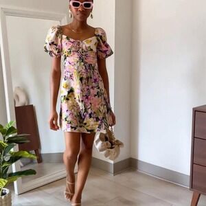 H&M Puffy Sleeve Feminine Floral Pink, yellow and Lavender Mini Dress