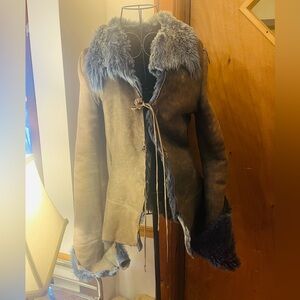 Discover the perfect blend of style and comfort with this elegant women's teddy jacket. Featuring a luxurious thick blue fur, this jacket is ideal for staying warm and fashionable. Pre-loved and in great shape. The blue color is faded to gray but the fur is still bright blue. Still soft and cozy. Well loved.