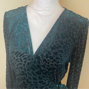 Emerald Leopard Velvet Wrap Dress Sz 12 Long Sleeve Animal Print V Neck Ruffle