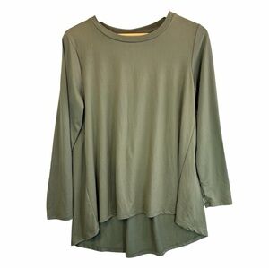 Bobeau top, olive green top, swing top, high low hem, long sleeve top, size large, casual top, everyday top, flattering top, soft top, relaxed fit, layering piece, fall top, spring top, versatile top, flowy top, Bobeau large, green long sleeve