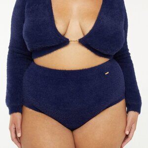 Booty Shorts: Soft, fluffy mohair-style sweater knit High-waist, moderate coverage Rose gold-tone 'Savage X' metal plate at the hip Ribbing at waist and leg-line.