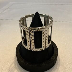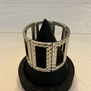 This bracelet had a warm, silver tone. It has several large, rectangular panels adding texture. Each panel features a window-like cutout with an open work design. The rectangular panels have a hammered design.
