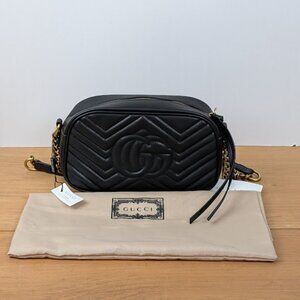 This is a brand new Gucci GG Marmont Small shoulder bag in black matelassé chevron leather. It has never been used and still has the tags attached. This is the "Small" camera bag size (not the Mini), which is spacious enough to fit a larger smartphone, a wallet, keys, and makeup essentials.