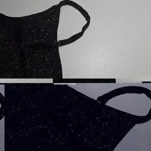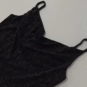 Semi sheer glitter stretchy mesh fabric, front half has some black lining in the bust. Thin spaghetti straps are adjustable.