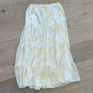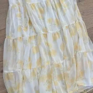 Embrace elegance with this beautiful floral skirt. Featuring a delicate yellow and white pattern, it's perfect for any occasion.