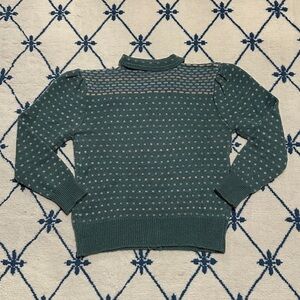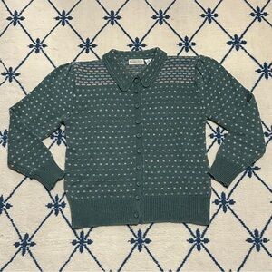Vintage green button up cardigan with puff sleeves and multi colored polka dot design. Excellent condition