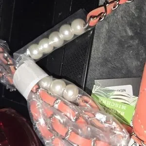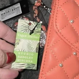 Stylish quilted design. Features pearl accents. Compact and chic. The dimensions on this bag are four and a half by 7 and 1/2. It will hold an Android phone with no problem and most iPhones. In the front you can put some credit cards and cash.
